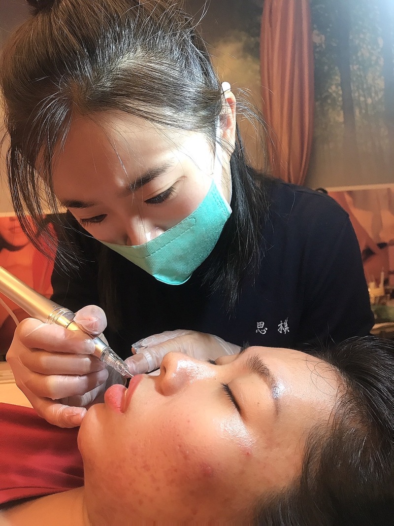 - 手持帶微電流之導入儀,順著肌膚紋理按摩達到拉提緊緻之效果。